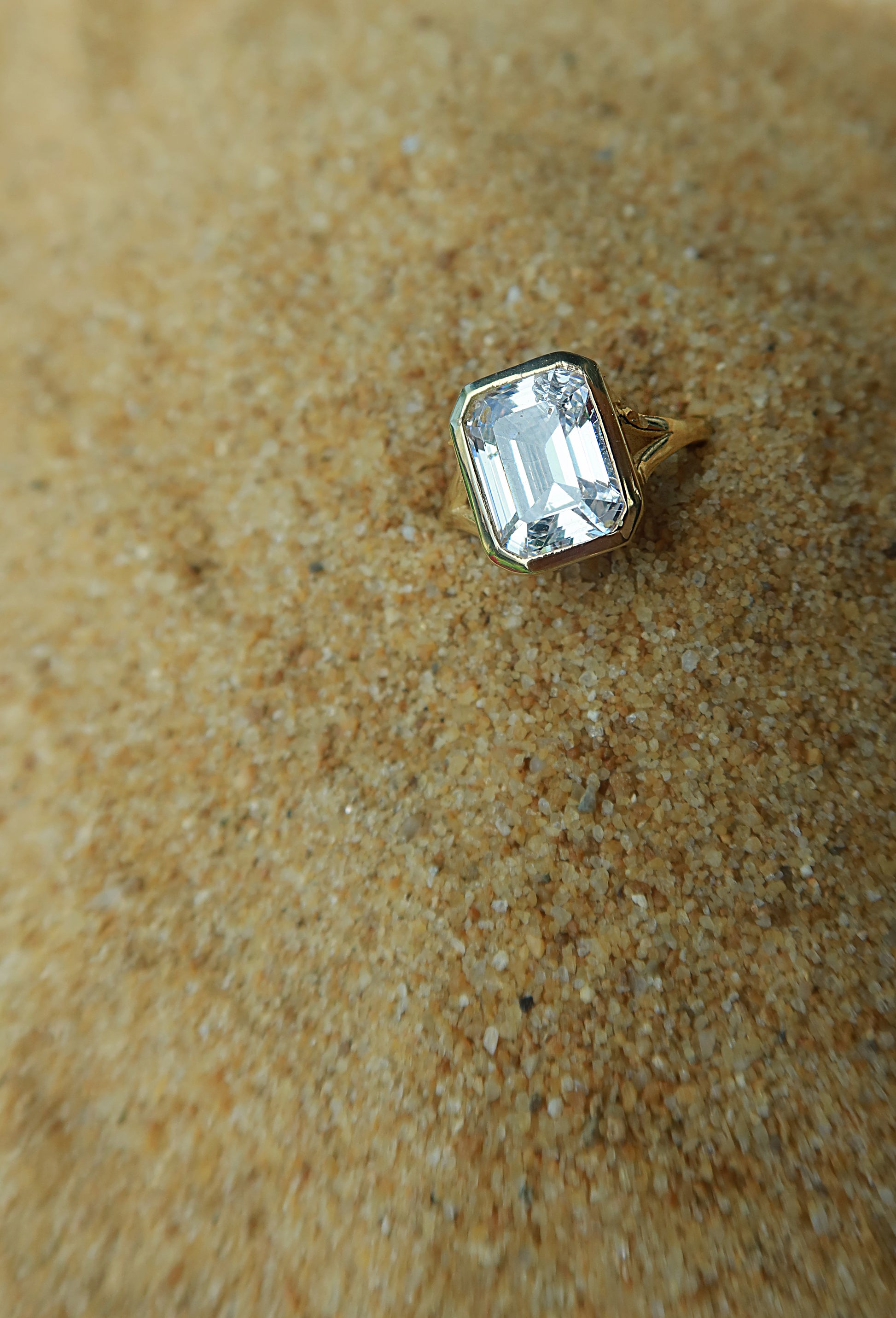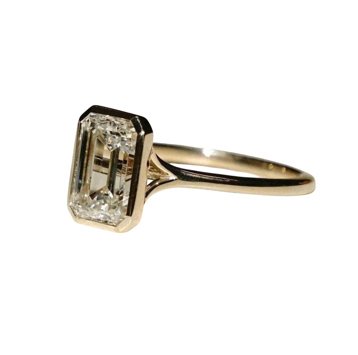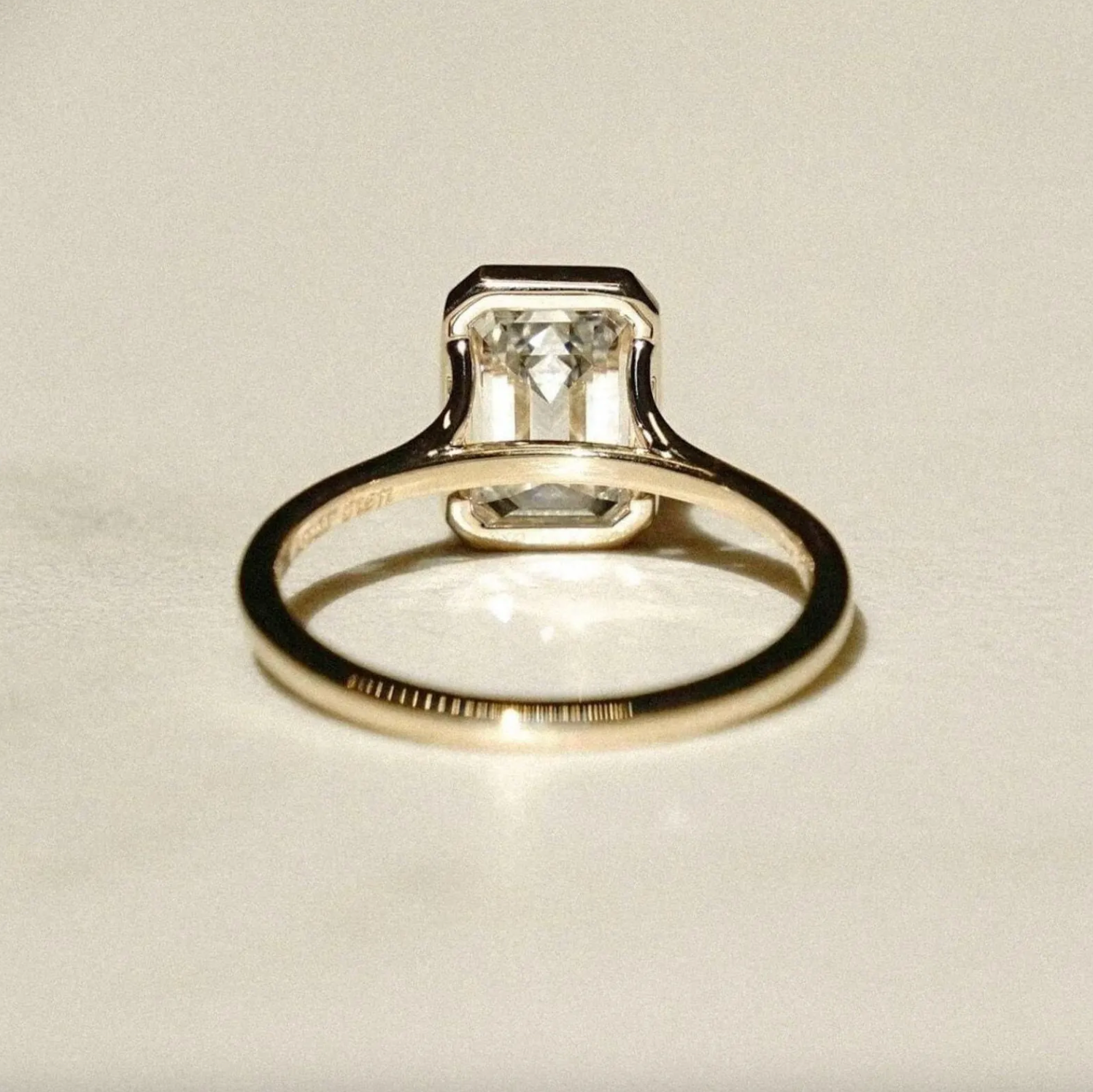 Refined in its simplicity and bold in its elegance, the Analia Bezel Ring is a celebration of enduring style. Inspired by the understated grace of Meghan Markle and the purity of minimalist design, this ring features a striking 3ct emerald-cut moissanite securely cradled in a sleek bezel setting that is in 14K gold vermeil. Its clean lines and mirror-like facets exude quiet sophistication, allowing the beauty of the stone to take center stage.