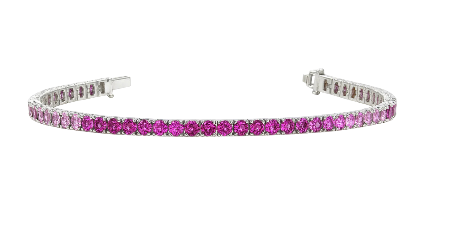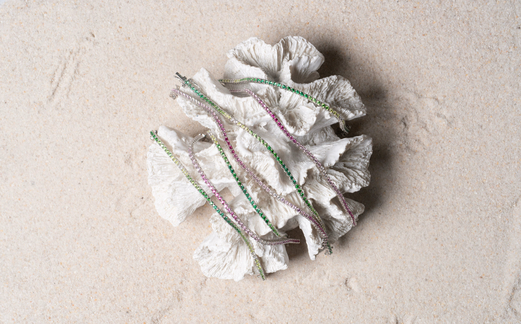 Named “Boli,” meaning shells in Dhivehi, the ombre tennis bracelets are perfect for island evenings and barefoot elegance. They come in either an ombre pink or ombre green and are set in sterling silver.