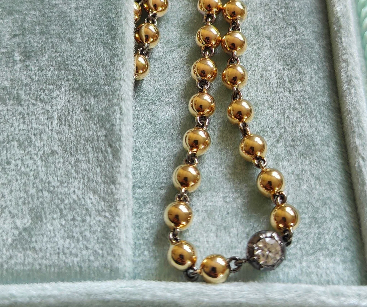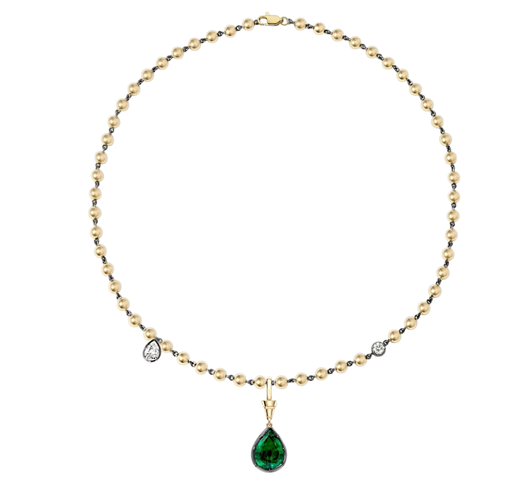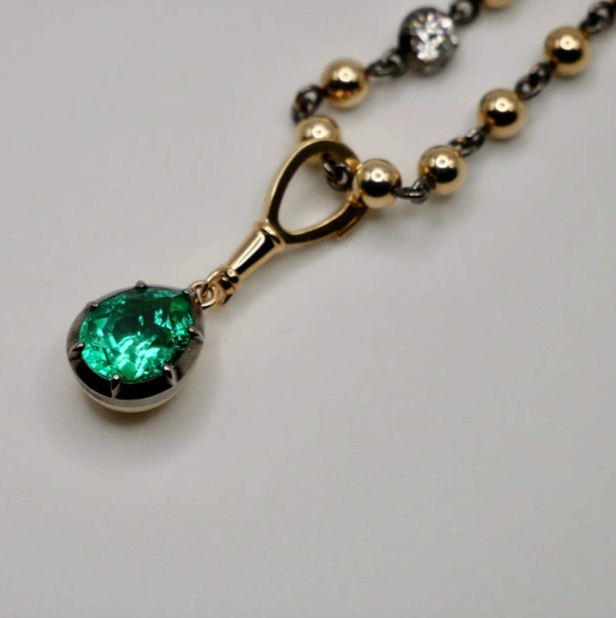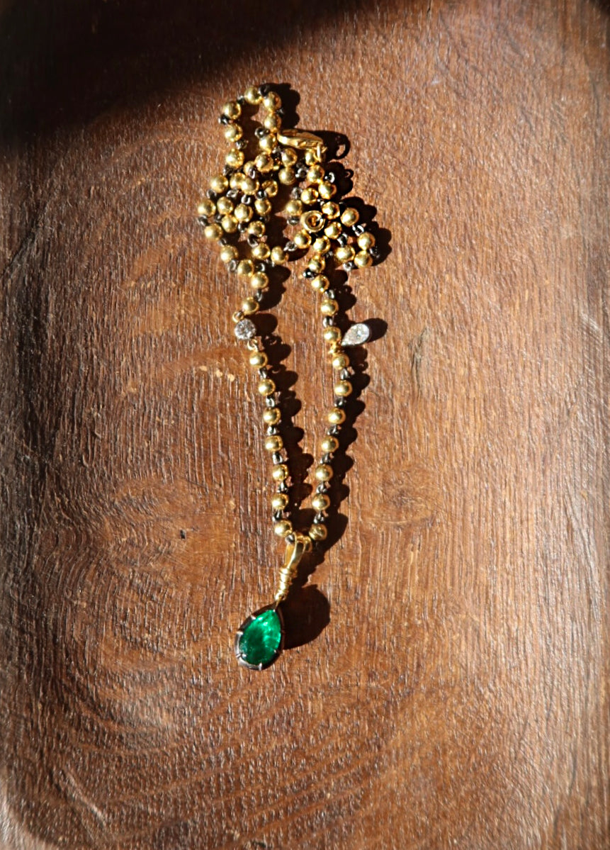 Our Elena necklaces are handmade in Turkey using 14K Gold vermeil in a Ball and Chain style with one round brilliant cut lab diamond and one pear diamond on opposite sides, set in a Georgian style cut-down setting with 14K blackened yellow gold. The centre stone is an emerald pendant with pear shaped lab emerald, set in a Georgian style cut-down setting using 14K blackened yellow gold.