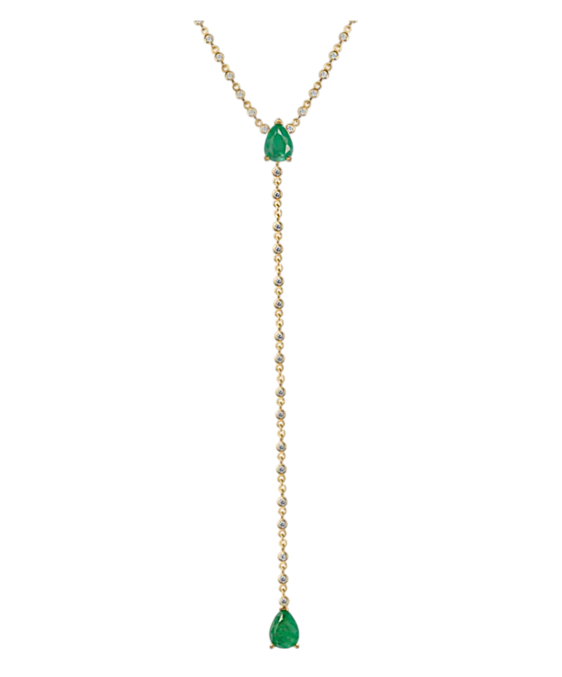 Our Fari lariat Necklaces are expertly crafted in Turkey using a 14 K gold vermeil chain and green pears as the accents. The chain has bezel set Swarovski crystals throughout it. "Fari" refers to the Maldivian reefs and the way the bright colours peek through the corals is reminiscent in this necklace.