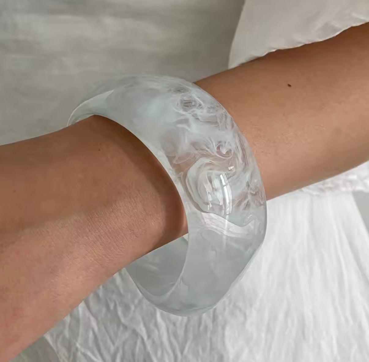 Reflecting light from every hand-sculpted ripple, the clear bangle is crafted with hand-polished lucite and has a bold, sculptural silhouette, that mimics the fluidity of water in motion.