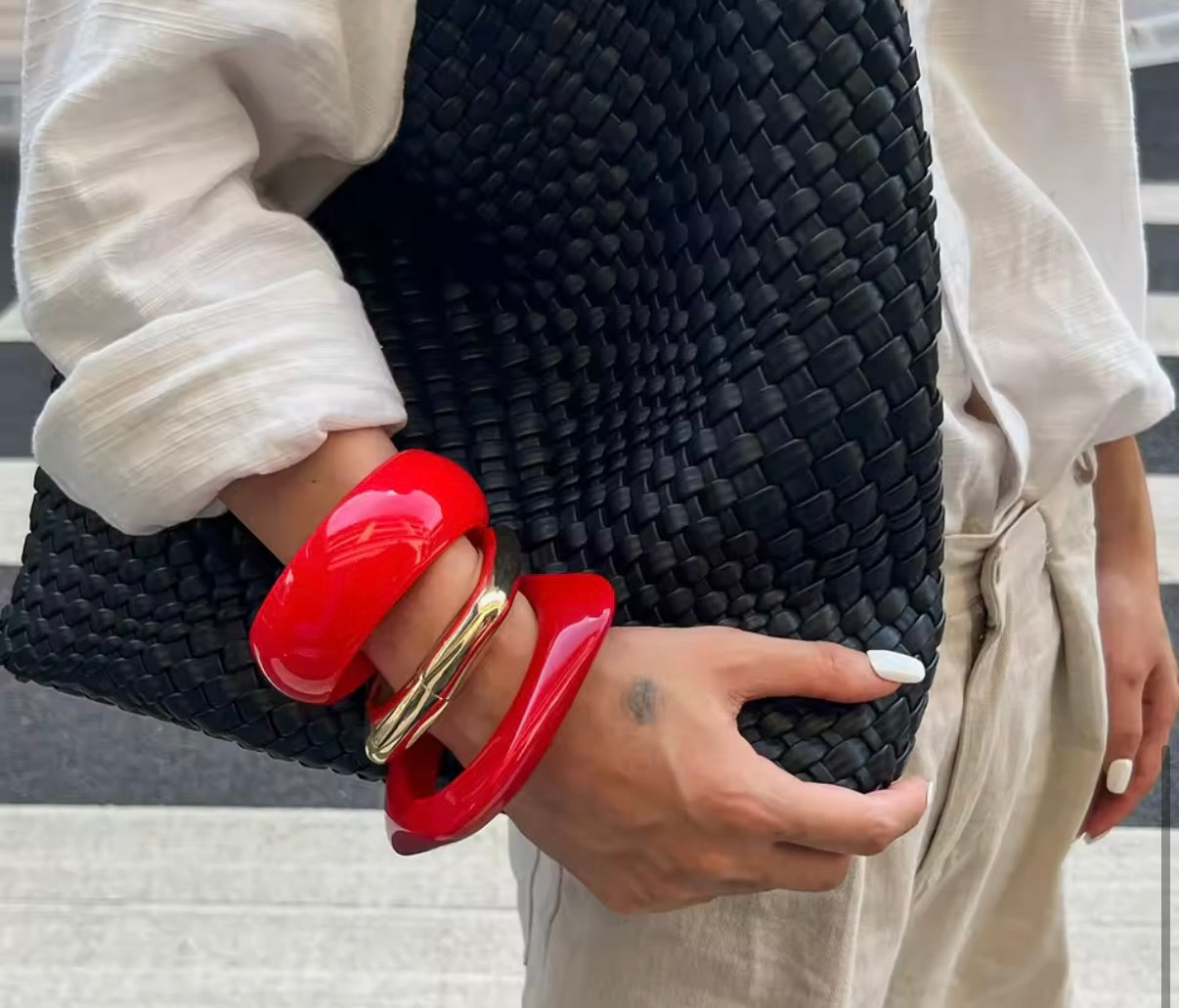 The sculptural 14k gold vermeil bangles also boast an organic silhouette that orbits nicely with the lucite bangles, or worn alone for a liquid gold effect.