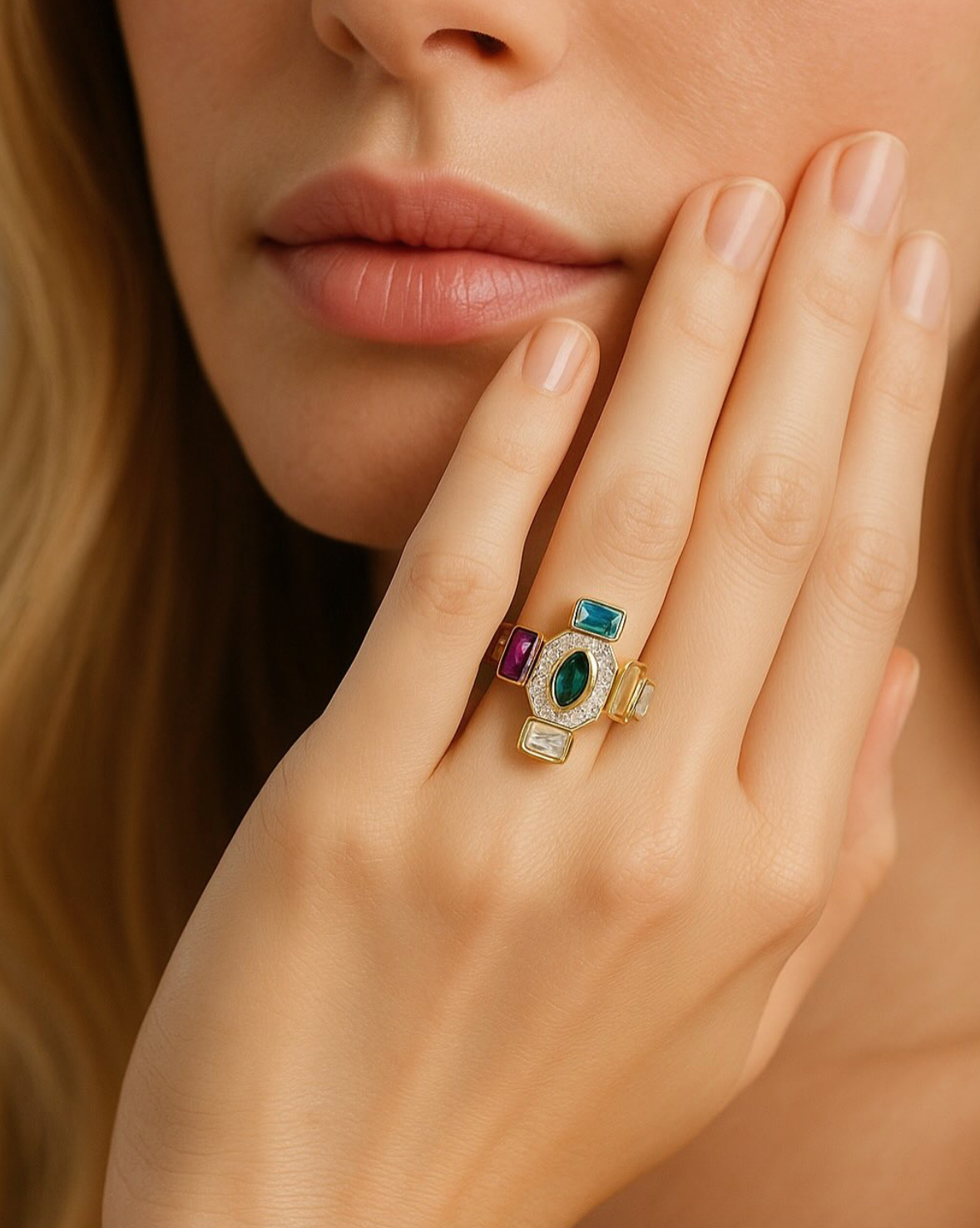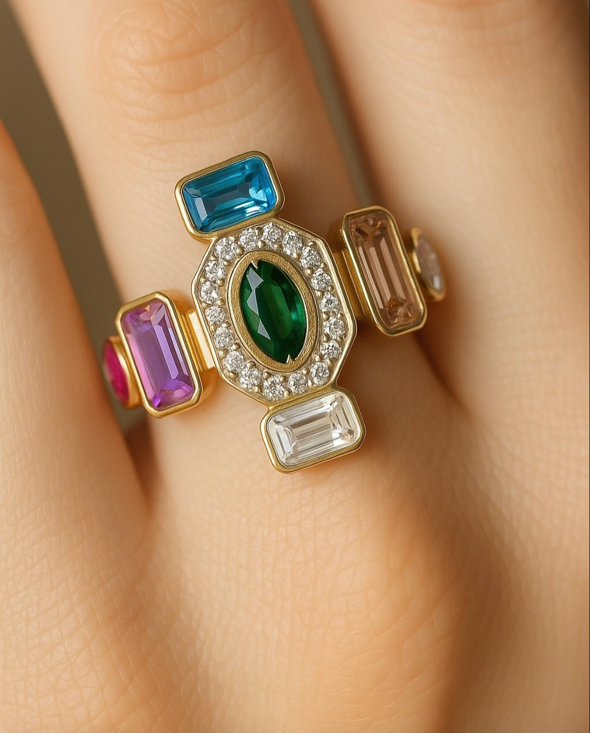 Handcrafted by skilled Turkish artisans, the Nexa ring is a graceful fusion of East and West. Encircling the central stone are bold, baguette-cut gems in vivid hues: sapphire blue, amethyst purple, ruby pink, and amber gold—echoing the kaleidoscopic palette of Moroccan bazaars and the golden hour glow over the desert.
