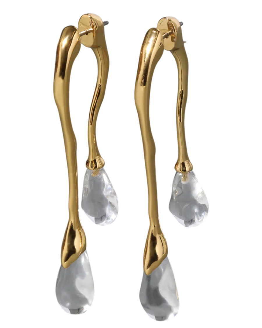 Our Noora Earrings are expertly crafted in Turkey using a 14K gold vermeil and clear lucite and rhinestones.