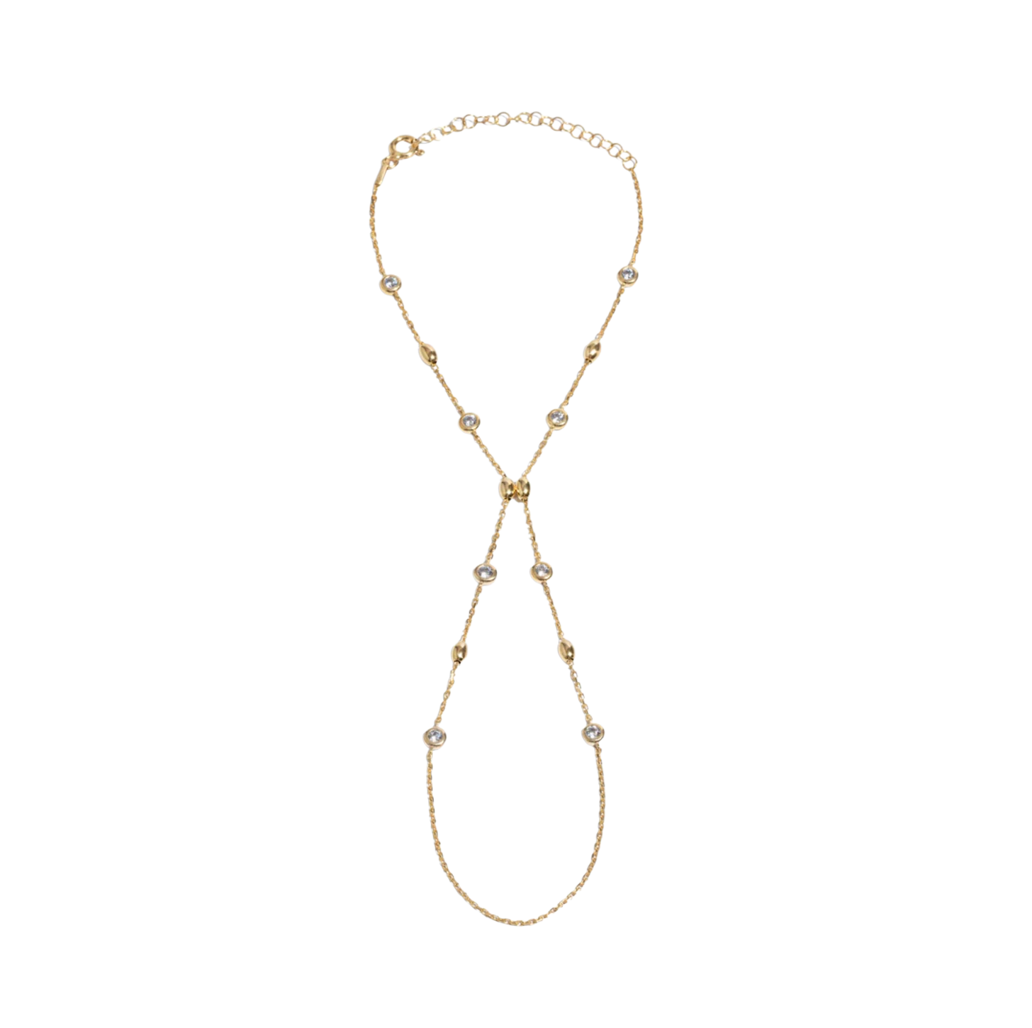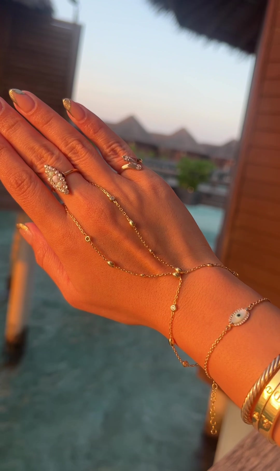 Embrace the radiant spirit of Marrakech with Nour, a delicate gold hand chain with interlocking stones and gold beads that captures the city’s enchanting blend of tradition and elegance. Crafted with intricate details reminiscent of Moroccan artistry, this piece glows with a warm golden hue that mirrors the vibrance of the Red City. This hand chain has been crafted in 14K gold vermeil.