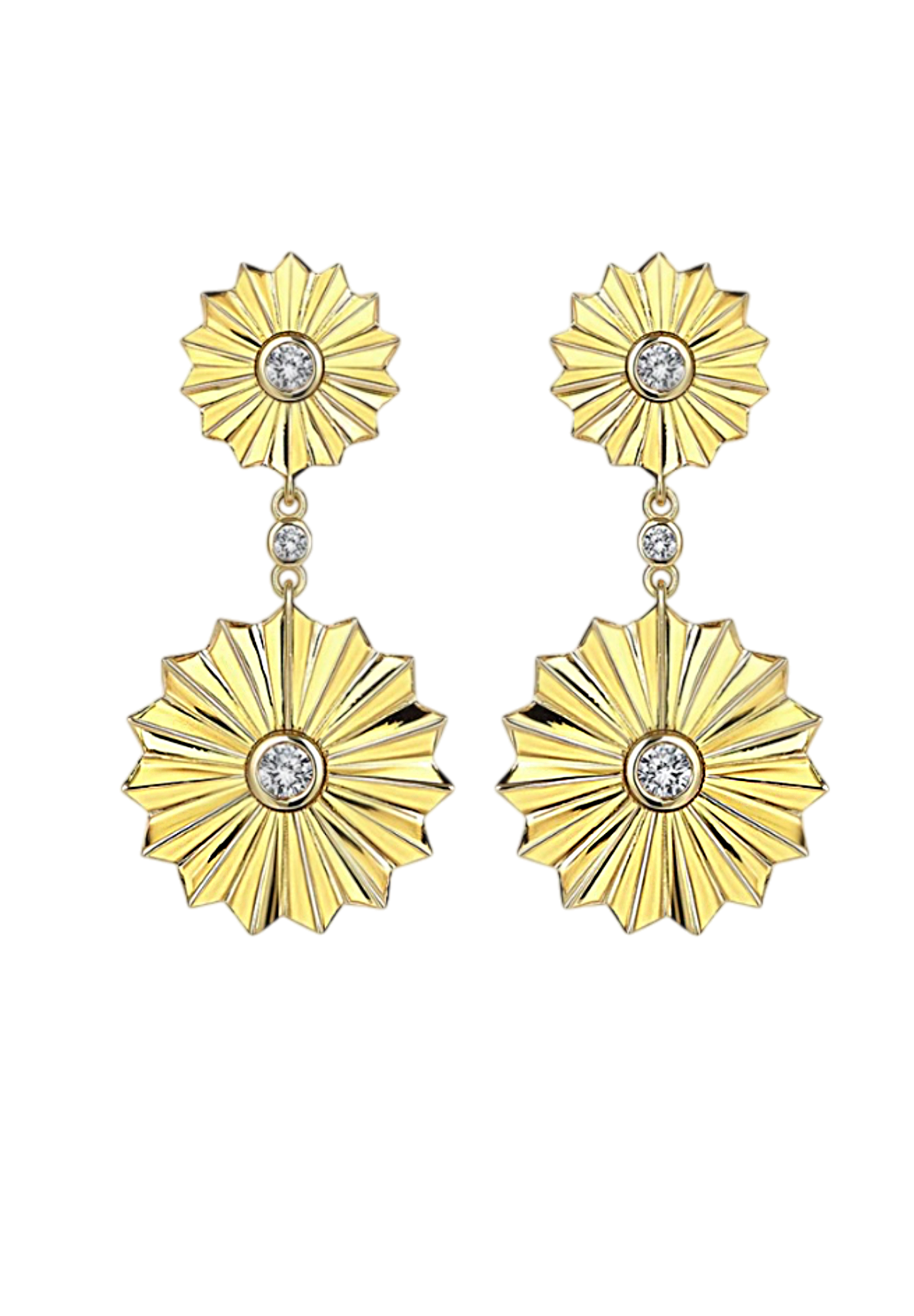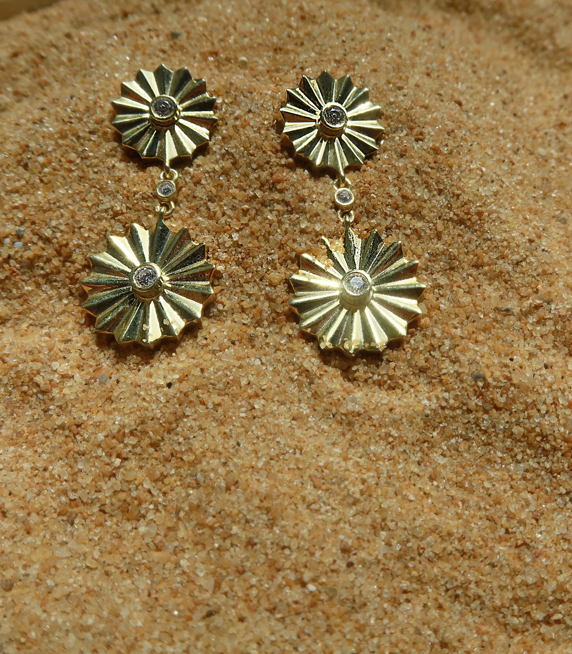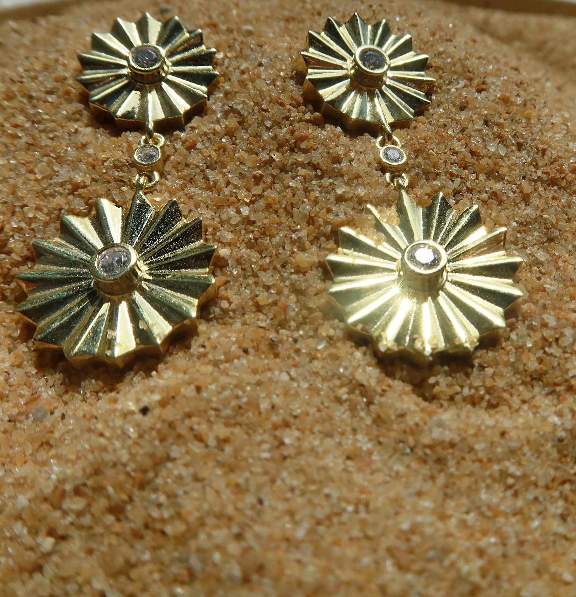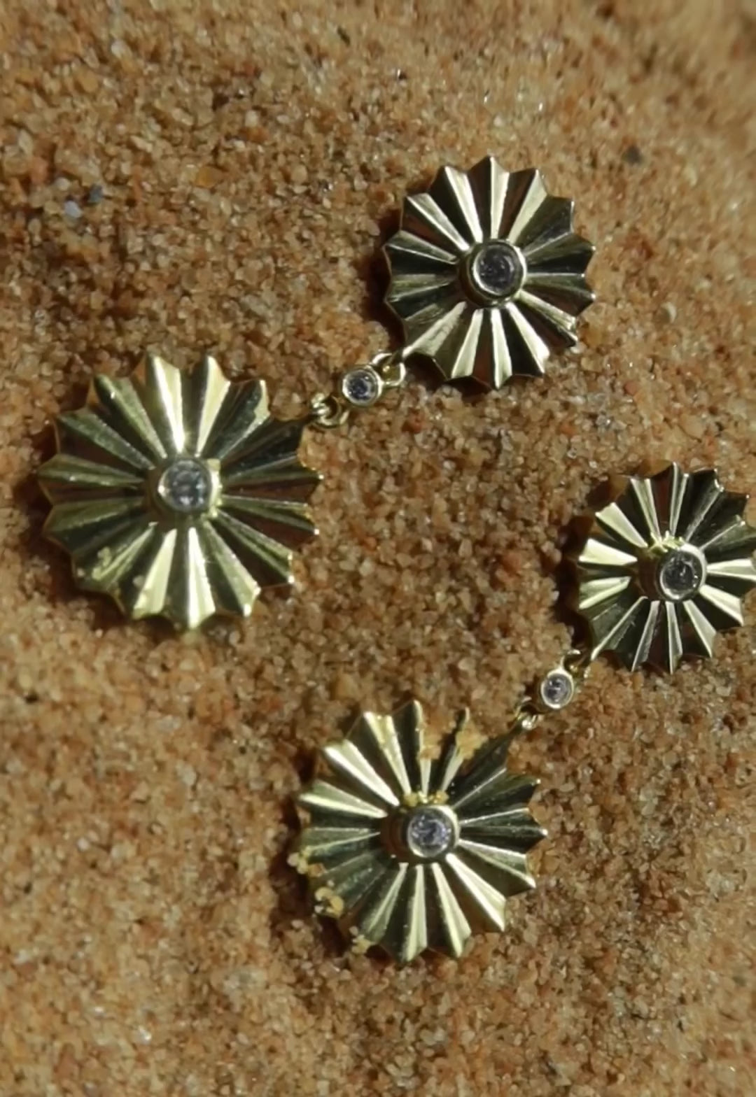 Inspired by the warm, golden rays of the Moroccan sun, the Shams Earrings—named after the Arabic word for "sun"—is a bold tribute to light, energy, and heritage. Crafted in 14K gold vermeil, these sculptural earrings fan out in a mesmerizing sunburst pattern, echoing the geometry and spirit of Moroccan design. At its center, a brilliant-cut stone features the essence of sunlight, sparkling with every movement.