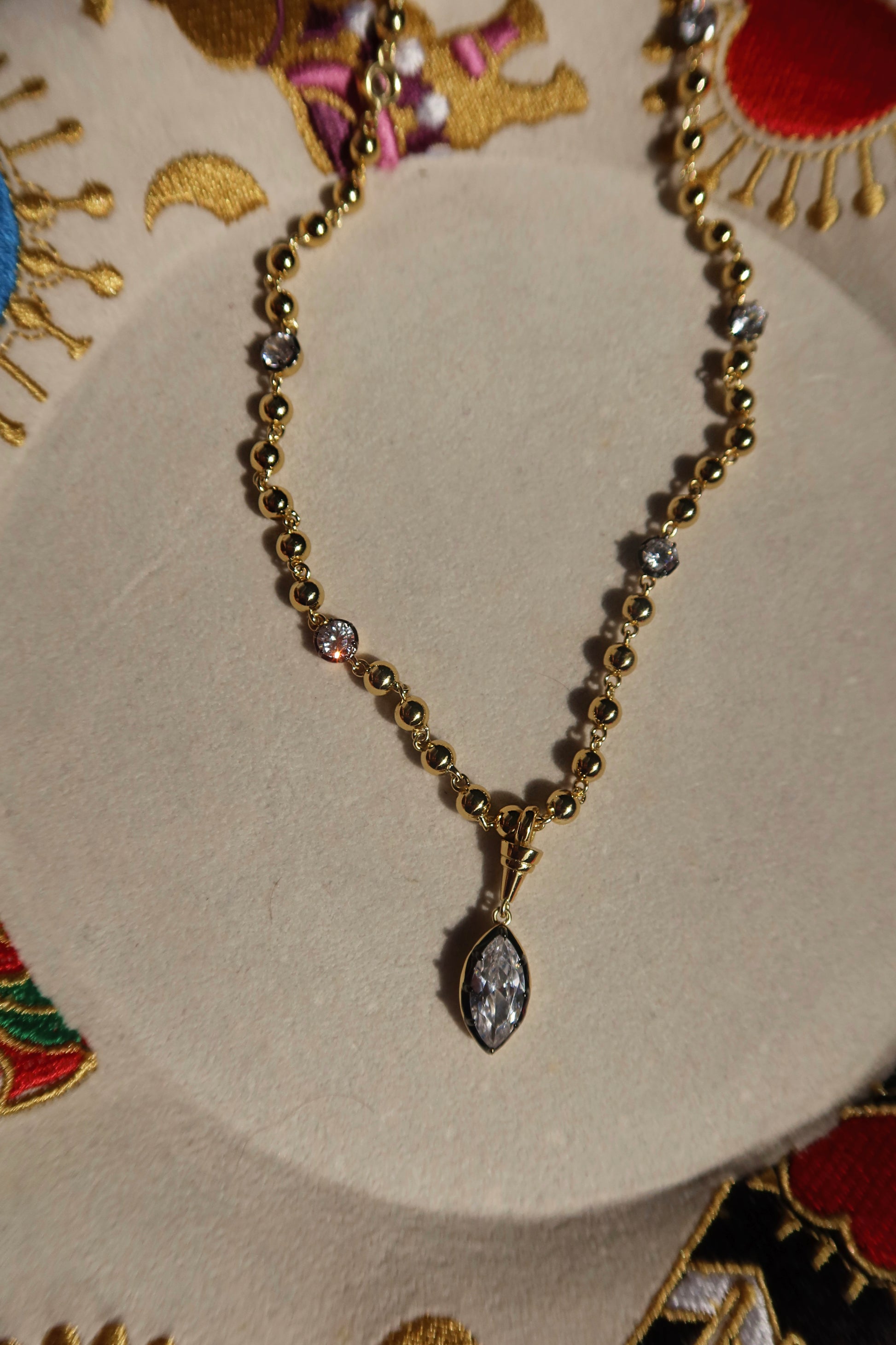 Our Zyna Necklaces are expertly crafted in Turkey using 14K gold vermeil that has been blackened at the corners for a buttercup victorian setting. The chain has an alternating ball and stone effect and comes with a centre marquise pendant with the same buttercup setting. This kind of 2 tone buttercup setting enhances the size and brightness of the stones, giving the illusion that they are floating on your neck.